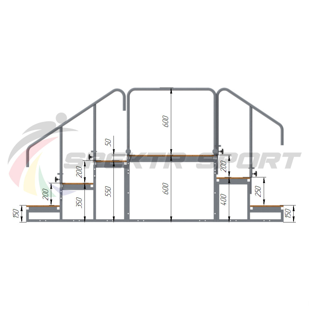 Конструкция разборная. Представляет собой пластформу, лестницу с тремя ступенями, лестницу с 2 ступенями, регулируемые по высоте поручни. Ступени можно устанавливать в двух положениях – угловое и прямое (с любой стороны платформы).